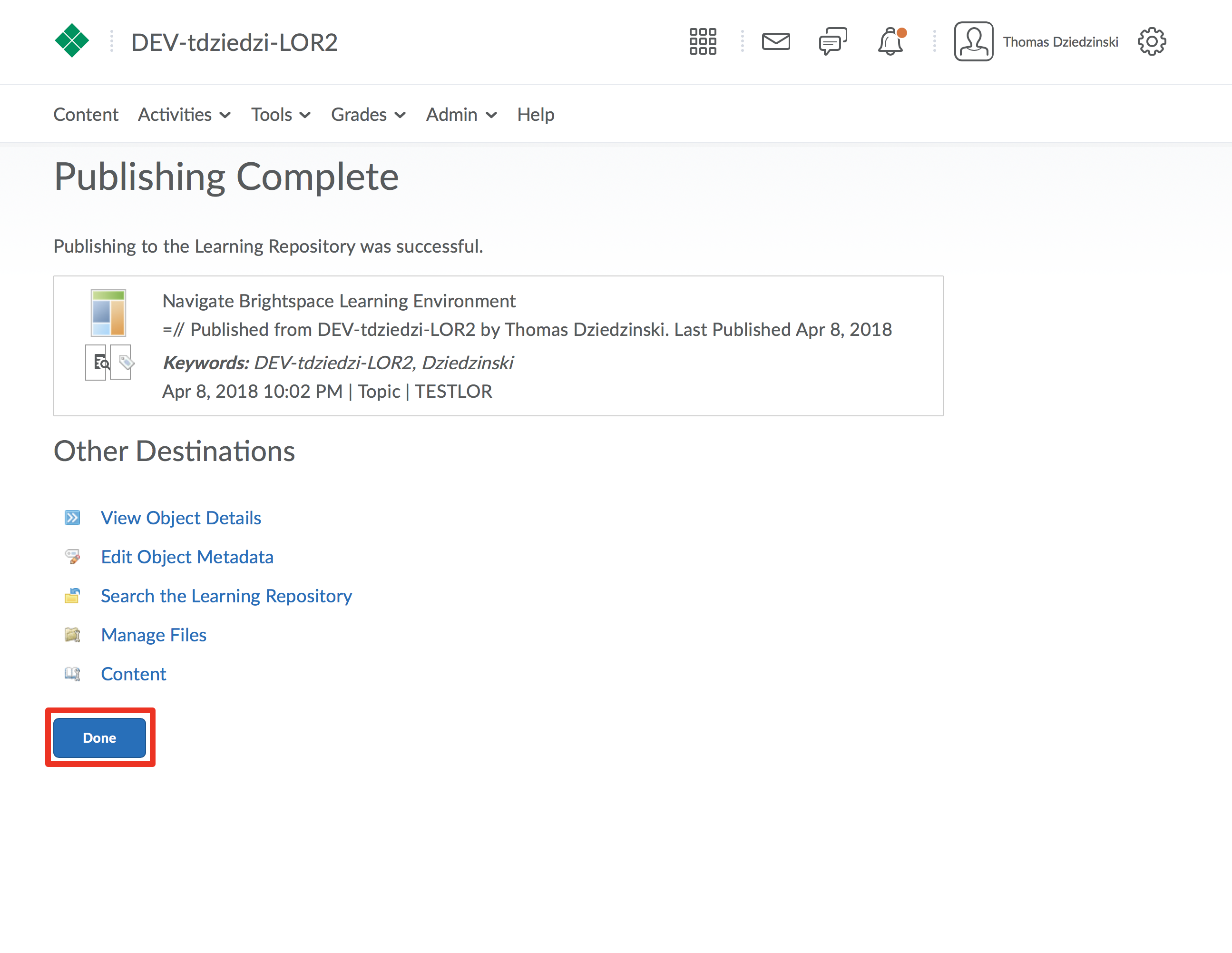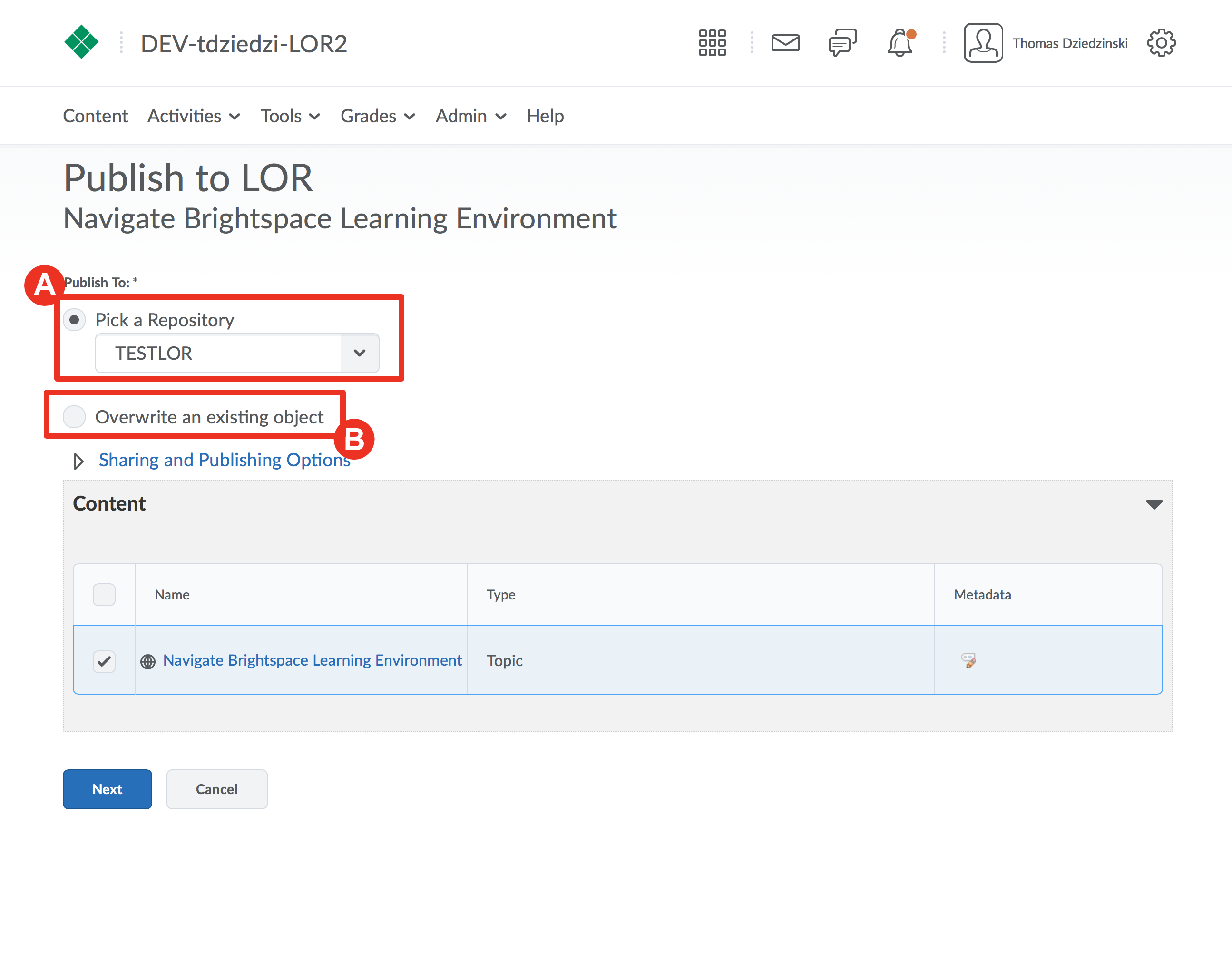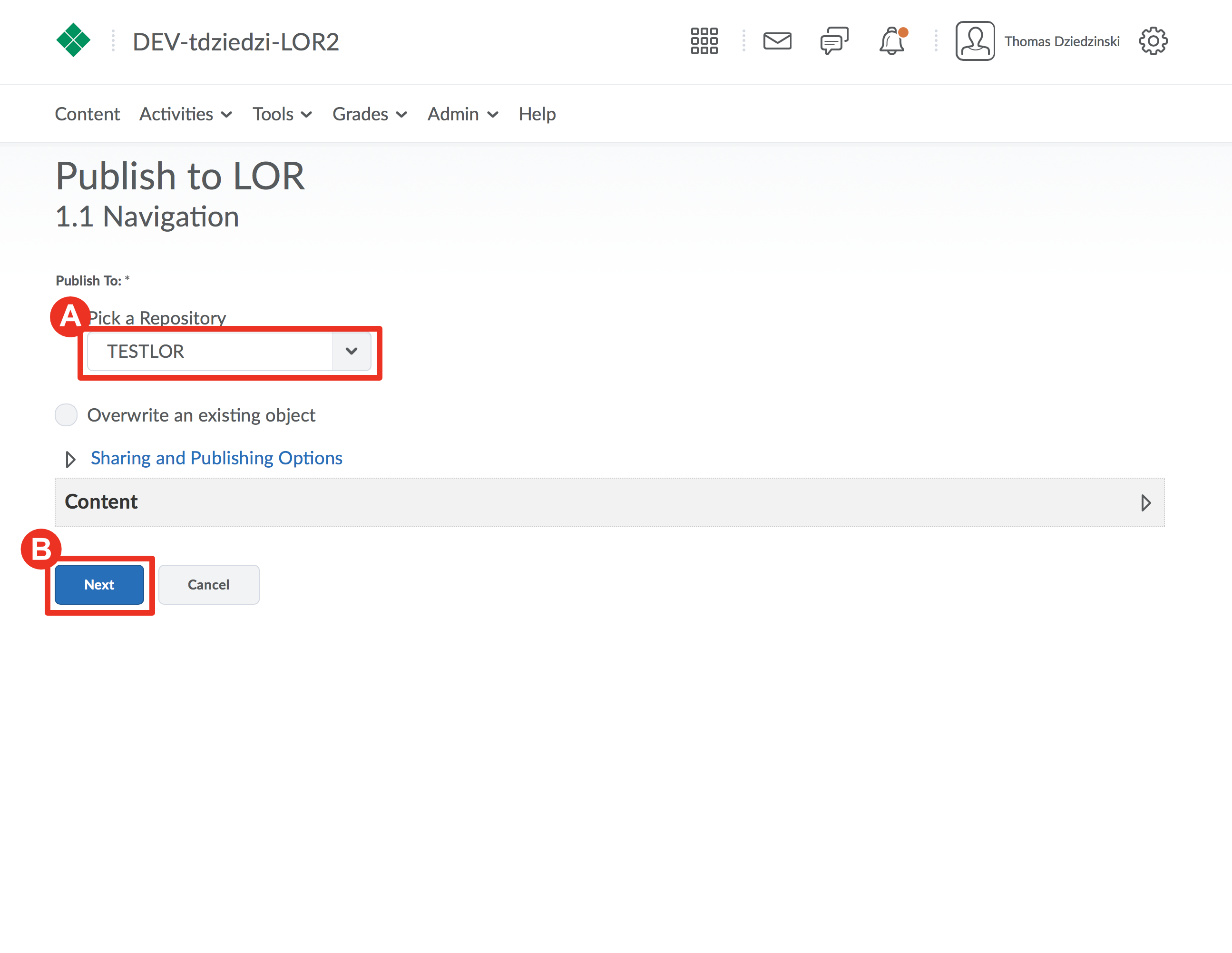 Step 5On the next page, choose between two options: Select a repository (A) or Overwrite an existing object (B) Note: Overwriting will be covered in the final part of this module. Click here to access it. We will focus the next steps publishing a new object. Choose Pick a Repository |