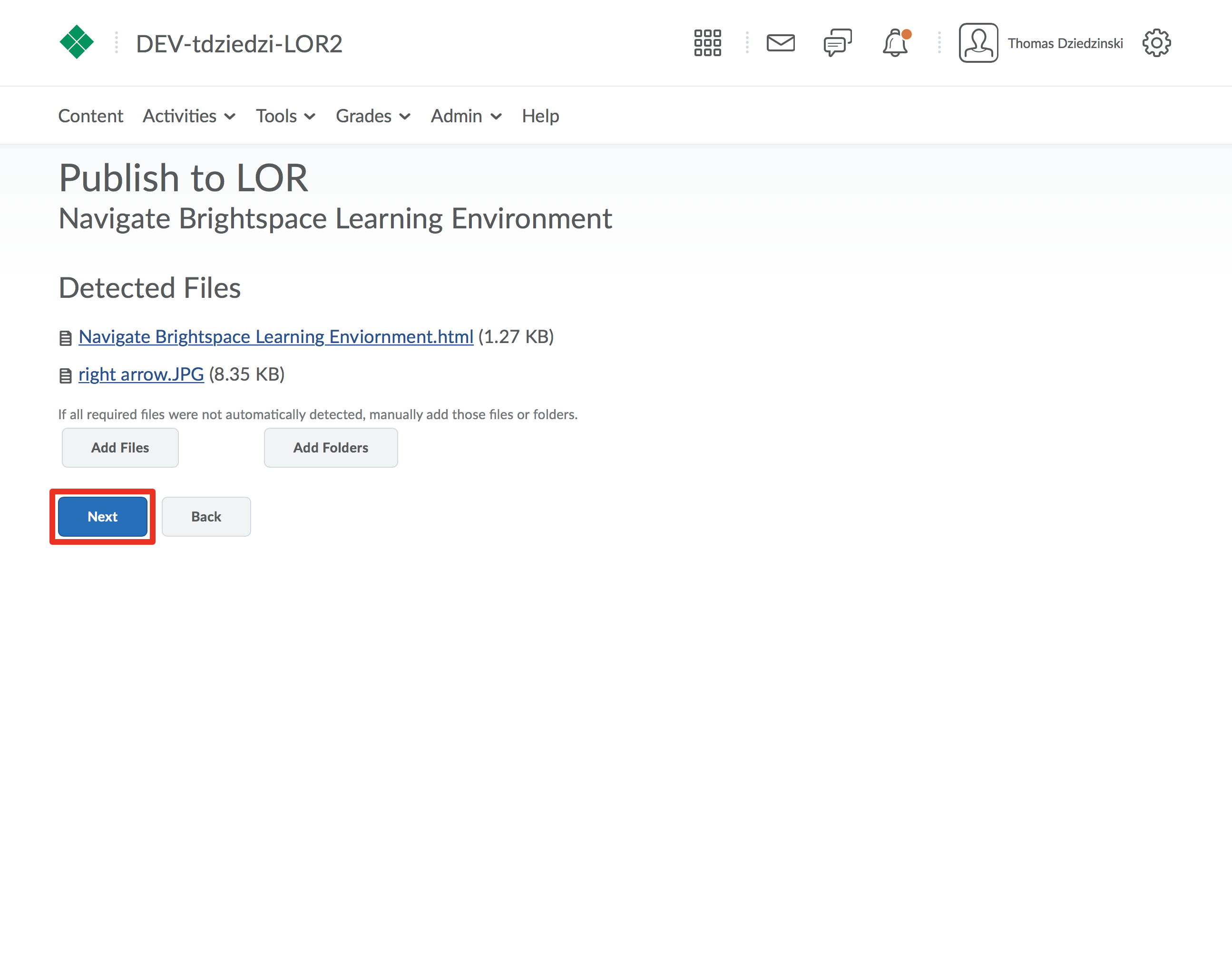 Step 7If you are publishing objects that have files included in them, make sure they are detected and listed on this screen. If they are not, you can add files and folders from your course. Click "Next" |